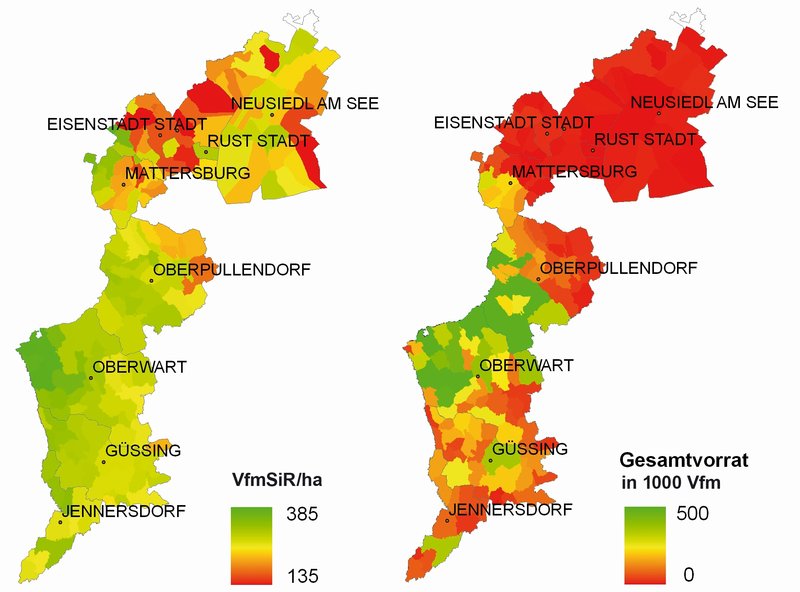 Das alleine wäre wahrscheinlich den getätigten Aufwand nicht Wert. Mit der Vorratskarte können aber auch Ergebnisse für kleinere Einheiten wie etwa für Gemeinden geschätzt werden. Dies gilt nicht nur für die Hektarvorräte, sondern auch für den Gesamtvorrat. Dieser kann dann darüber hinaus noch in die vier Baumartengruppen Nadelholz, Laubholz und zwei Mischtypen aufgeteilt werden. So eine Auswertung zeigt die Abbildung 3 für das Burgenland beispielhaft für Nadelholz.