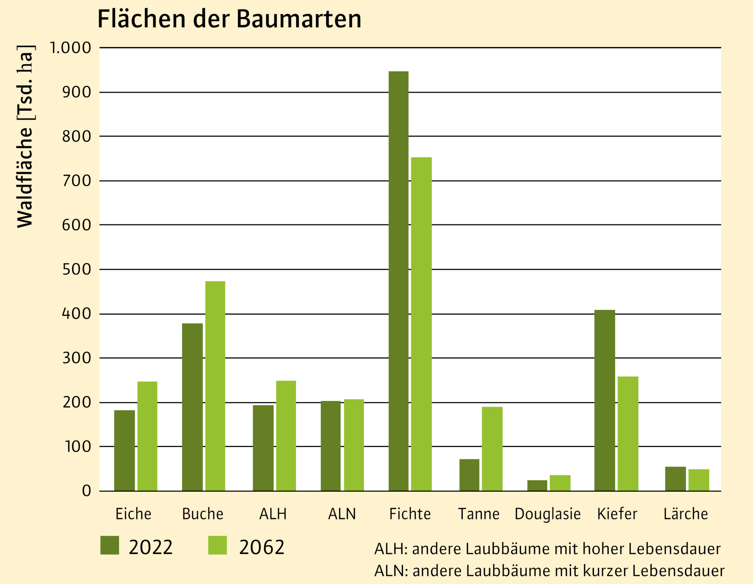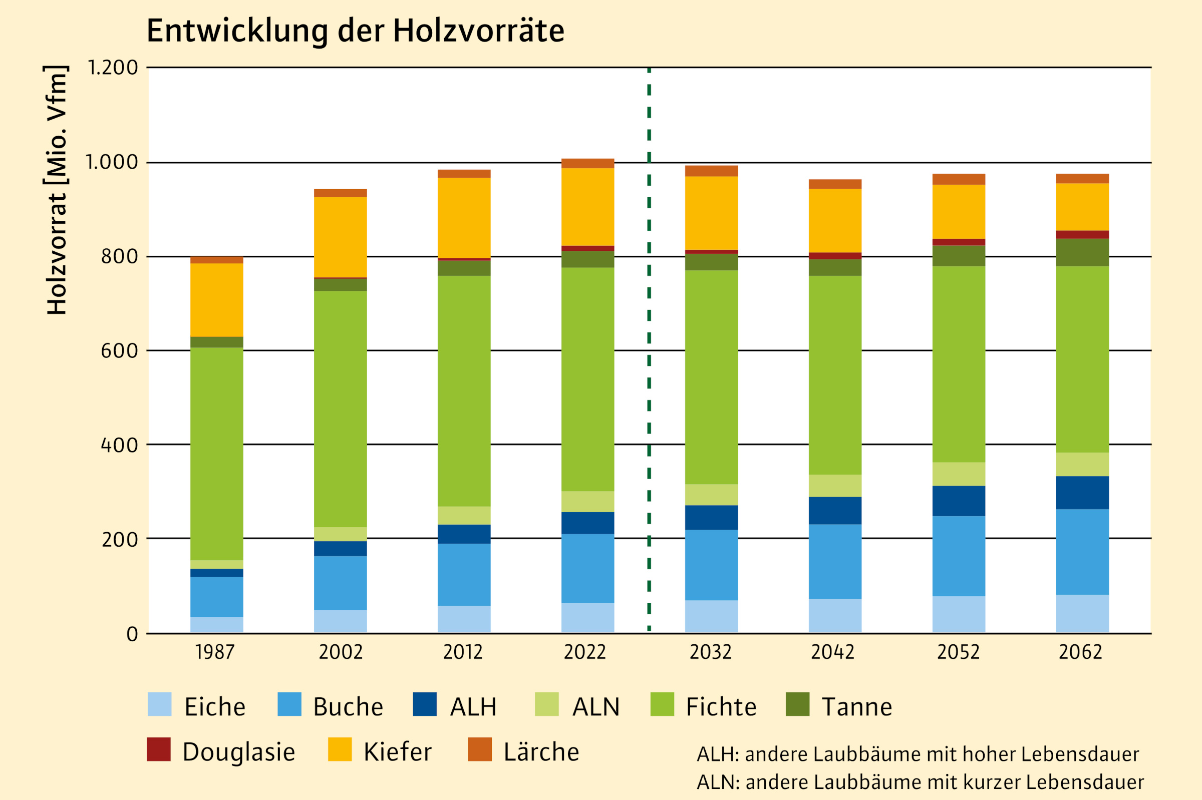Auf der Basis der Bundeswaldinventur 2022 wurde gemeinsam vom Bund und den Ländern die künftige Waldentwicklung und das mögliche Holzaufkommen über einen Zeitraum von 40 Jahren in einem sogenannten Basisszenario modelliert. Für Bayern ergibt dieses spezielle Szenario bei Fichte und Kiefer einen Rückgang der Flächen und der Holzvorräte. Die Laubbäume sowie Tanne und Douglasie gewinnen dagegen an Fläche und Holzvorrat hinzu. Die Gesamtvorräte würden jedoch ungefähr auf dem Stand von 2022 bleiben. Zusätzliche Nutzungspotenziale bestehen in den kommenden Jahrzehnten insbesondere bei den Laubbäumen, aber auch bei der Kiefer. Die Nutzungen bei der Fichte könnten über die kommenden vier Jahrzehnte etwa auf dem Niveau der letzten Inventurperiode bleiben. Dies setzt jedoch voraus, dass es gelingt, den Schadholzanfall bei der Fichte einigermaßen in Grenzen zu halten.