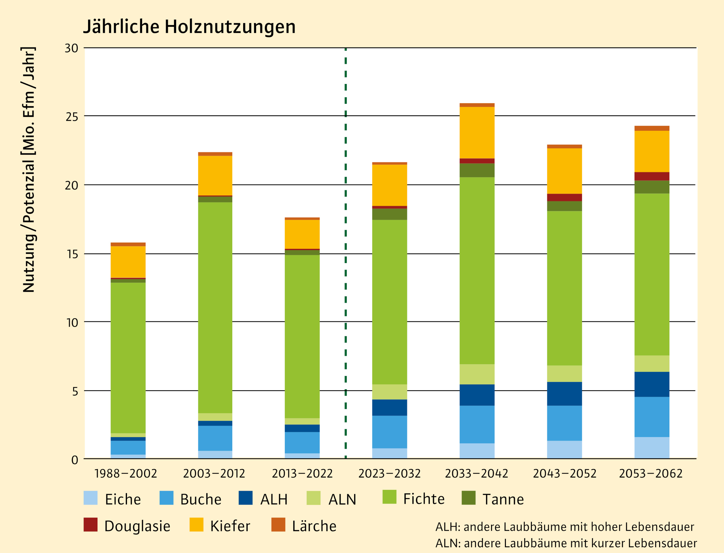 Die im Basisszenario modellierten Nutzungspotenziale und die Nutzungen in der Vergangenheit sind in Abbildung 4 dargestellt. Im Mittel liegt das Nutzungspotenzial in dem 40-jährigen Zeitraum bei 23,7 Mio. Erntefestmeter pro Jahr und damit 6 % über den Holzentnahmen von 2003 bis 2012 und 35 % über denen der letzten Inventurperiode. Bei der Fichte würden die Nutzungen gegenüber 2013–2022 zunächst etwas steigen, später aber wieder auf dem Niveau der letzten Inventurperiode bleiben. Bei der Kiefer würden die Nutzungen um etwas mehr als die Hälfte größer sein als in der letzten Inventurperiode. 2022 waren 57 % der Kiefernbestände älter als 100 Jahre. Viele Kiefern sind inzwischen hiebsreif oder werden es bald sein. Dies erklärt den deutlichen Anstieg des Nutzungspotenzials. Auch bei Tanne und Douglasie liegen die Nutzungspotenziale deutlich über den historischen Nutzungen.