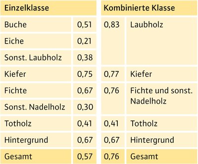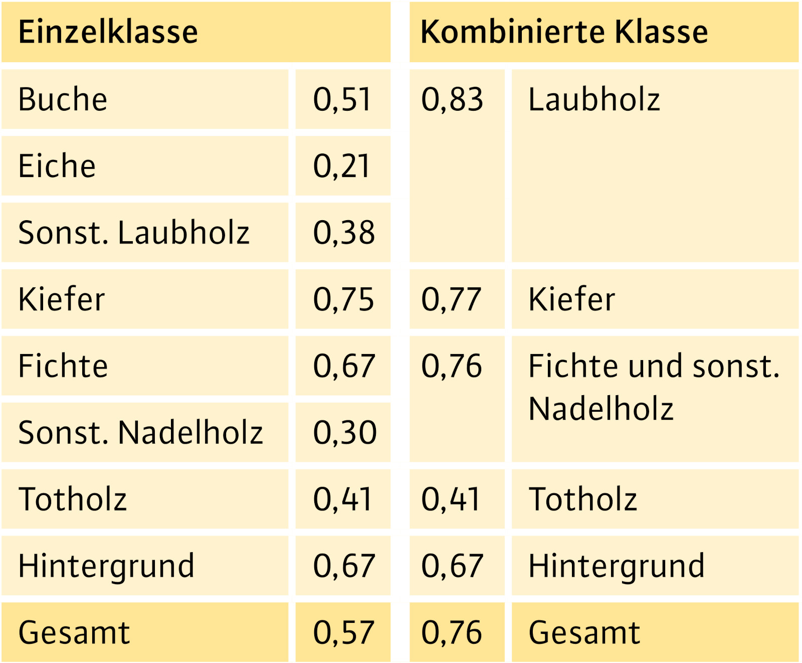 Eine Analyse der Verwechslungen zwischen diesen beiden Klassen zeigte den großen Einfluss des Bildmaterials auf, da hier Artefakte (künstliche Strukturen wie Kanten oder Verzerrungen aus der Orthorektifizierung) häufig waren und somit offenbar einen direkten Einfluss haben.