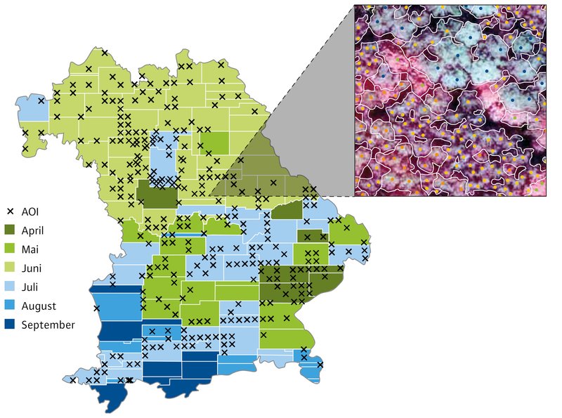 Abb. 2: Monate der Luftbildbefliegungen 2018/19 mit Positionen der über Bayern verteilten Referenzdatenerfassung. Rechts: CIR-Luftbild-Ausschnitt und erzeugte Referenzdaten mit verschiedenen Baumarten am Beispiel einer Traktecke von 50 x 50 m.