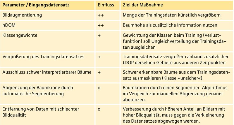 Untersucht wurde auch der Einfluss zusätzlicher Eingangsdaten (z. B. Baumhöhen) oder von Bildaugmentierung. Bei letzterer werden die Originalbilder geometrisch (z. B. Drehen, Spiegeln) oder inhaltlich (z. B. Hinzufügen von Rauschen) manipuliert, um die Robustheit des Modells zu erhöhen und den Datensatz zu vergrößern.