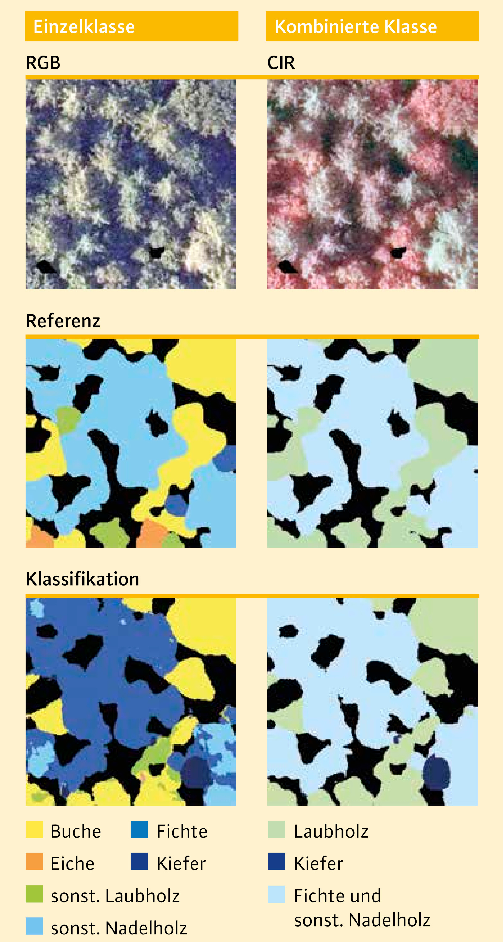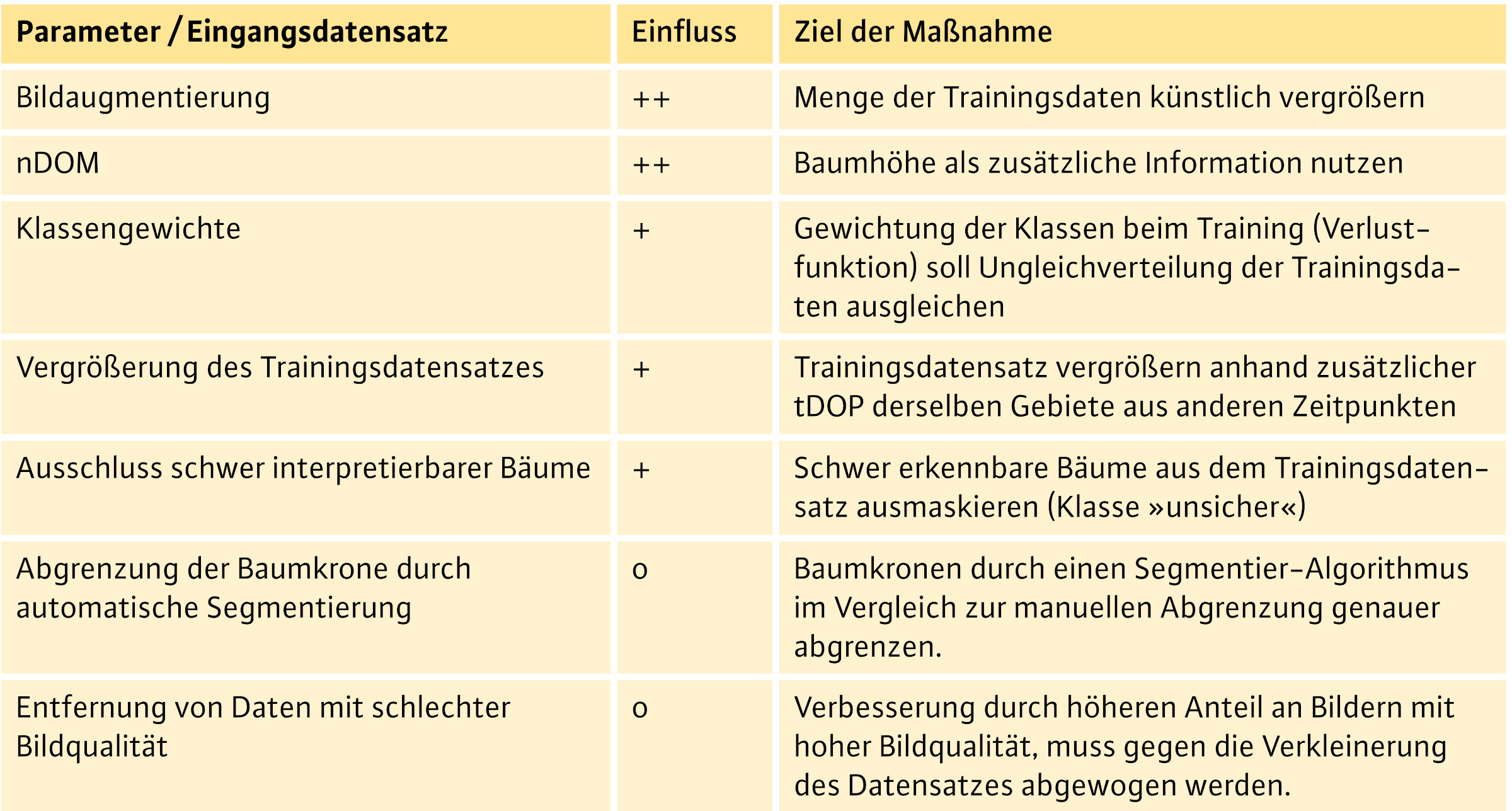 In den eingangs erwähnten Projekten BeechSAT und IpsSAT erzielte DL gegenüber ML bessere Ergebnisse bei der Unterscheidung zwischen gesunden und geschädigten oder abgestorbenen Bäumen. Jedoch war dabei die Klassenanzahl gering und die Klassen deutlich abgrenzbar. In unserer Studie zeigte die hohe Anzahl an Klassen, insbesondere die der Laubhölzer, nur geringe spektrale und strukturelle Differenzen, sodass diese auch durch Nutzung von DL nicht zuverlässig zu trennen waren. Eine Unterscheidung von Laub- und Nadelhölzern war jedoch zuverlässig möglich.