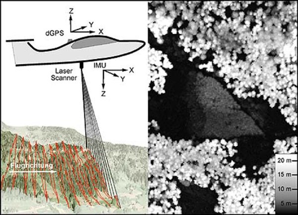 Im Zuge von flugzeuggetragenem Laserscanning wird die Erdoberfläche mittels ausgesandter, stark gebündelter Laserimpulsen abgetastet (Abbildung 1); die Erdoberfläche und die darauf befindlichen Objekten reflektieren die Impulse. Die Laufzeit jedes Impulses zwischen Aussendung und Empfang wird gemessen und gemeinsam mit der aufgezeichneten Richtung des ausgesandten Impulses sowie der Position des Laserscanners in einen 3D-Punkt des Landeskoordinatensystems umgerechnet. Der Großteil der eingesetzten Laserscanner registriert den ersten und den letzten empfangenen Impuls (First-/Last-Pulse-System). Die neueste Generation von Laserscannern registriert jedoch die gesamte reflektierte Impulsform, womit alle Objekte in der Bahn eines Laserimpulses detailliert beschrieben werden können. Derartige Full-Waveform Laserscanner sind speziell für forstliche Anwendungen viel versprechend.