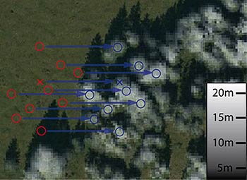 Da die Probeflächenmessungen der ÖWI für die Kalibrierung der Vorratsmodelle dienen, ist eine exakte Co-Registrierung der ÖWI-Stichprobenflächen auf die ALS-Daten erforderlich. Die mit GPS gemessenen Koordinaten der ÖWI Probeflächen sind dafür meist nicht ausreichend genau (Abbildung 2).