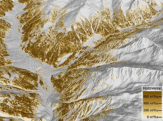 Diese Unsicherheit erscheint auf den ersten Blick hoch. Sie wird jedoch sicherlich immer geringer, je größer die Fläche ist, für die der Vorrat bestimmt werden soll. Wie groß sie letztlich für 100 Hektar oder auch für eine gesamte Bezirksforstinspektion ist, wird derzeit noch untersucht. Mit Hilfe des Modells soll der Holzvorrat für die gesamten 97.000 Hektar Wald Vorarlbergs ermittelt werden. Die beispielhaft gezeigte Holzvorratskarte (Abbildung 3) weist ebenso wie die aus den ALS-Daten abgeleiteten topographischen Modelle eine Rasterweite von 1 m auf.