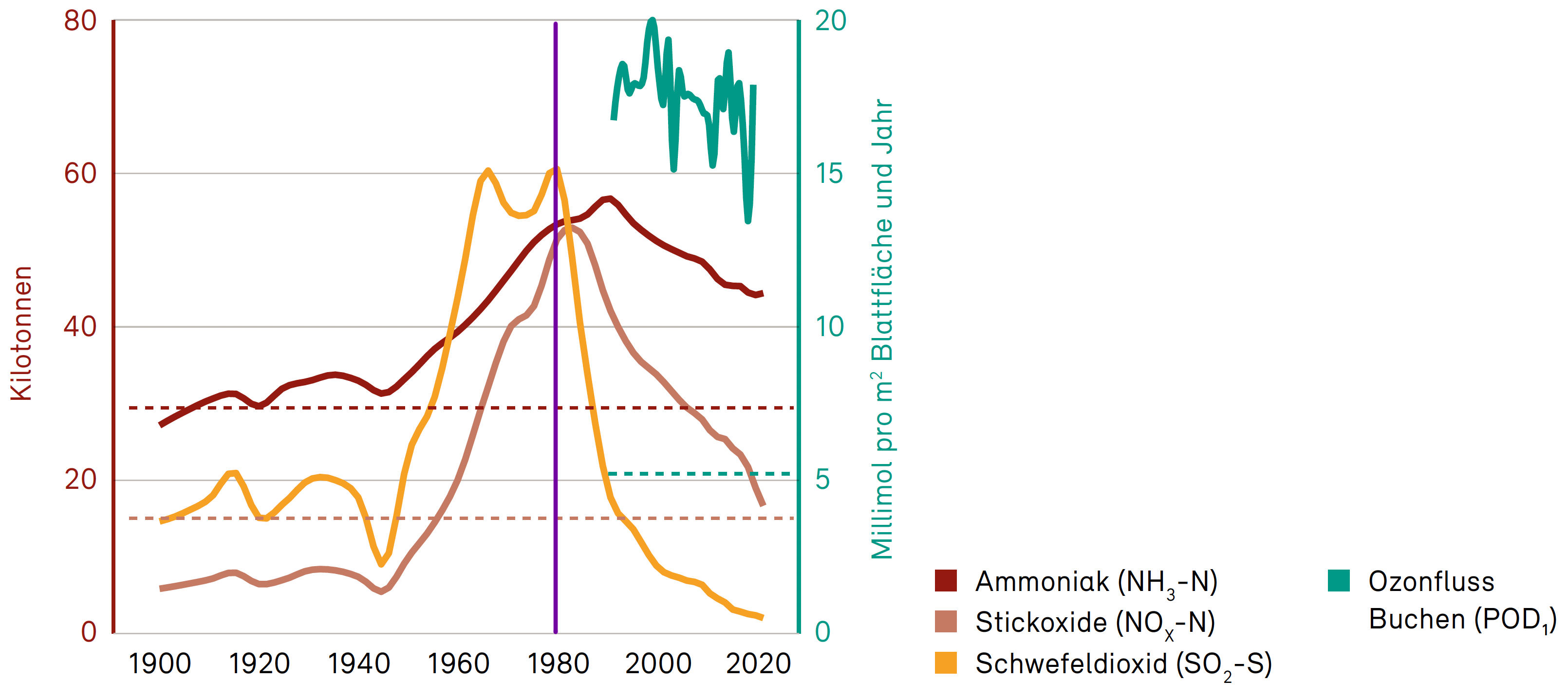 Abb. 6. Emissionen von Luftschadstoffen in der Schweiz von 1900 bis 2020 und Entwicklung des Ozonflusses (POD1) für Buchen (grün). Die gestrichelten Linien entsprechen den Zielvorgaben gemäss dem Luftreinhalte-Konzept des Bundesrates von 2009 für NOx und NH3 sowie den von der UNECE festgelegten kritischen Belastungswerten für Ozon.