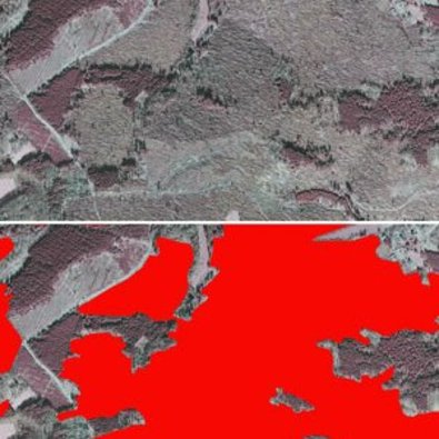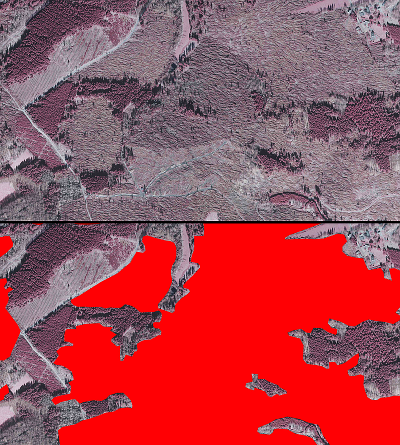 Abb. 4: Gleicher Bildausschnitt aus der CIR-Befliegung zweifach dargestellt: (oben: ohne Windwurfflächen-Layer; unten: rot markierte Windwurfflächen)