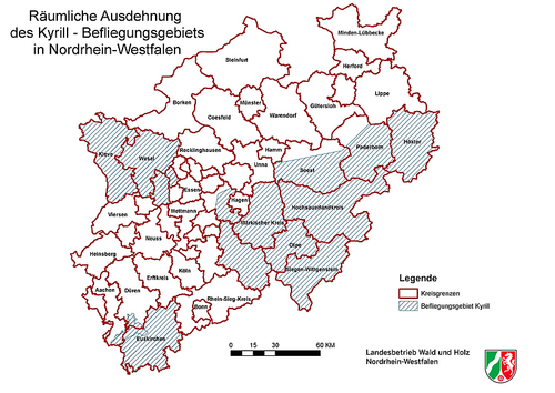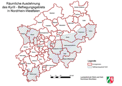Der Landesbetrieb Wald und Holz NRW hatte unmittelbar nach dem speziell für die Wälder Nordrhein-Westfalens folgenschweren Orkan "Kyrill" vom 18.-19.01.2007 eine fernerkundungsgestützte Erfassung der Windwurfflächen in Auftrag gegeben. Die Bilddaten der im Auftragsumfang enthaltenen Color-Infrarotbefliegung, die aufgrund von schlechten Witterungsverhältnissen erst einen Monat nach "Kyrill" durchgeführt werden konnte, können nach wie vor über das Internetportal Waldinfo.NRW unter “Erweiterte Dienste” als zusätzlicher Kartendienst hinzugeladen werden.