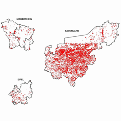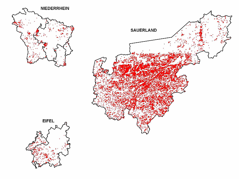 Bei der schnellen Vorerfassung der Windwurfflächen durch die POI's konnten im Befliegungsgebiet Sauerland 21.184, im Befliegungsgebiet Niederrhein 803 und im Befliegungsgebiet Eifel 519 Punkte gesetzt werden. Die erfassten POI's lieferten somit eine wichtige Grundlage für die Logistik der Holzabfuhr, die für die Aufarbeitung der Sturmschäden in Nordrhein-Westfalen unabdingbar war. Abb. 3 verdeutlicht das enorme Ausmaß der betroffenen Flächen insbesondere im Befliegungsgebiet Sauerland.