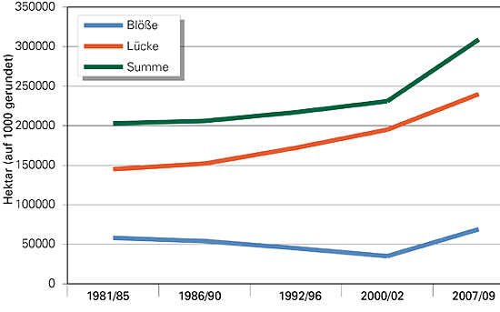 Schon in früheren Erhebungsperioden wurden temporär unbestockte Waldflächen nach ihrer Größe in Lücken und Blößen eingeteilt. Zwischen den Erhebungsperioden 1981/85 und 2000/02 nahmen die kleineren Freiflächen (Lücken) kontinuierlich zu, die Blößen gingen zurück. Dieses Bild änderte sich jedoch zwischen den Inventurperioden 2000/02 und 2007/09 (Abbildung 1).