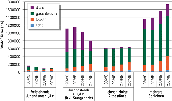 Im Ertragswald hat der Anteil von Wäldern mit mindestens zwei deutlich unterschiedlichen Bestandesschichten in allen Höhenlagen zugenommen. Ihre Fläche stieg zwischen 1986/90 und 2007/09 von 1.363.000 ha auf 1.736.000 ha um 27% an, wobei den größten Anteil an dieser Zunahme lockere Bestände ausmachen.