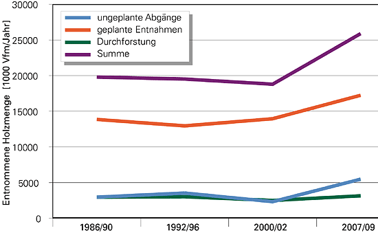 Zeigte die gesamte entnommene Holzmenge seit 1986/90 eine leicht fallende Tendenz, erfolgte 2000/02 eine Trendwende. Die ÖWI-Ergebnisse 2007/09 weisen im Vergleich zur Periode 2000/02 einen starken Anstieg der jährlich aus dem Wald entnommenen Holzmenge um 34% von 17,5 auf fast 23,5 Millionen Vfm aus. Dazu kommt noch der natürliche Holzabgang (z.B. durch Absterben), der sich für diese Zeitspanne von 1,3 auf 2,3 Mio. Vfm/Jahr erhöhte (Steigerung um 76% seit 2000/02).