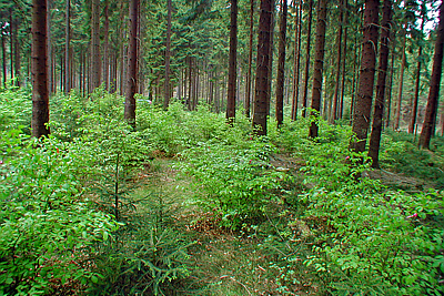 Trotz aller Kalamitäten ist Fichte aber noch immer die Baumart, die die höchsten Erträge erzielt. Stabilisierung der Fichte und Baumartenwechsel zu ebenfalls wirtschaftlich interessanten Baumarten sind unser Weg. Daher werden planmäßig andere stabilere Baumarten gefördert: Tanne, Douglasie, Hybridnuss und Kirsche.