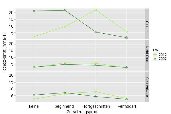 Gegenüber 2002 haben die Gesamtvorräte an Totholz in Baden-Württemberg leicht zugenommen. Während auf den Sturmwurfflächen die Totholzvorräte von fast 50 m3/ha auf unter 40 m3/ha deutlich abnahmen, sind sie auf der übrigen Fläche von ca. 14 auf ca. 16 m3/ha angestiegen. In der Gesamtsumme ergibt sich dadurch die leichte Zunahme von 2012 gegenüber dem Stand von 2002. Das Totholz auf den Sturmwurfflächen befinden sich mittlerweile fast durchwegs in einem fortgeschrittenen bis moderartigen Zersetzungsstadium, während im übrigen Wald die beginnenden Zersetzungsstadien vorherrschen (Ab. 10).