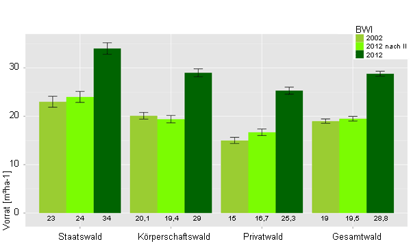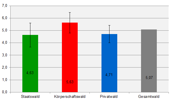 Im Gesamtwald betragen die Totholzvorräte durchschnittlich 19,5 m3/ha nach dem alten und 28,8 m3/ha nach dem neuen Berechnungsverfahren. Der Staatswald erreicht gegenüber den anderen Waldbesitzarten signifikant überdurchschnittliche Werte von 34 bzw. 24 m3/ha (Abb. 9).