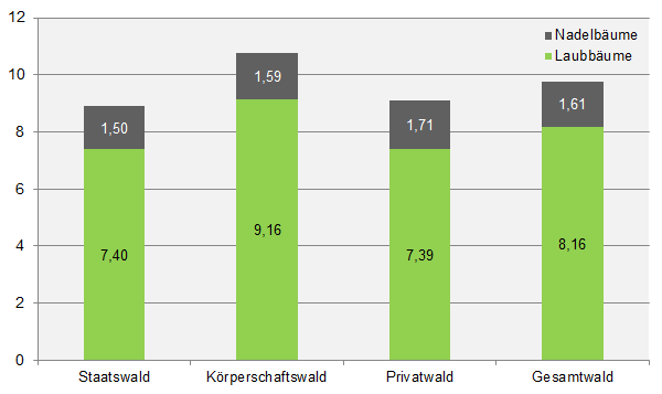 Dabei ist die Zahl der Biotopbäume im Kommunalwald etwas höher als in den anderen Waldbesitzarten. Der Grund dafür ist, dass der Kommunalwald höhere Laubholzanteile besitzt, denn nur etwa 20% des Holzvorrates der Biotopbäume gehören zum Nadelholz, 80% zum Laubholz. Das durchschnittliche Gesamtvolumen der Biotopbäume je Hektar beträgt über alle Waldbesitzarten hinweg knapp 10 Vfm (Abb. 13); das bedeutet, dass der durchschnittliche Biotopbaum in Baden-Württemberg ein Holzvolumen von etwa 2 Vfm hat.