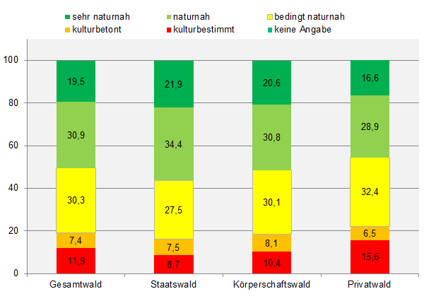 Nach dem Ergebnis der BWI3 fallen mehr als 50% der Wälder Baden-Württembergs in die Kategorien "sehr naturnah" und "naturnah". Dies ist in der Summe der höchste Wert aller deutschen Bundesländer. Im direkten Vergleich der Waldbesitzarten besitzt der Staatswald die höchsten Naturnähewerte (Abb. 6).
