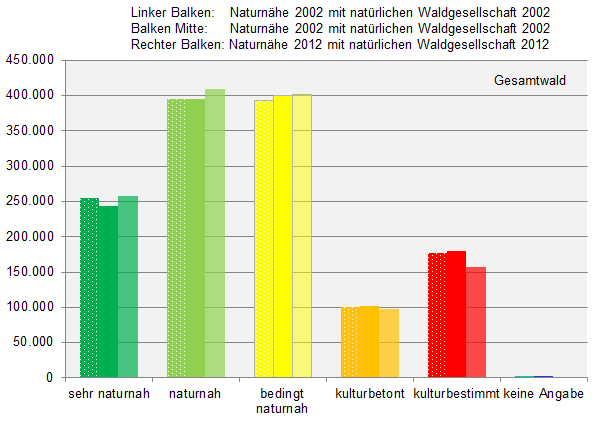 Weil mit dem Fortschritt der forstlichen Standortskartierung im Zeitraum zwischen der BWI2 und der BWI3 einzelne Änderungen in der Ansprache der natürlichen Waldgesellschaft verbunden waren, musste für die zeitlich vergleichenden Darstellungen die Naturnähe auf Stand des Jahres 2002 noch einmal auf der neuen Datengrundlage nachberechnet werden.