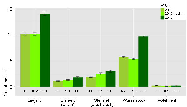 Vor der Interpretation der Totholzvorräte, die in der BWI3 gemessen wurden, sind einige methodische Hinweise notwendig. Von der BWI2 zur BWI3 wurde die Erfassungsschwelle für stehendes und liegendes Totholz von 20 cm auf 10 cm Durchmesser abgesenkt, und auch die Erfassungskriterien für Wurzelstöcke wurden verändert. Für den Vergleich der Werte war es deshalb erforderlich, die Werte für 2012 auch mit den alten Schwellen zu berechnen. Außerdem erwies es sich als sinnvoll, die vor dem Jahr 2002 großflächig entstandenen Sturmwurfflächen bei der Auswertung getrennt zu betrachten.
