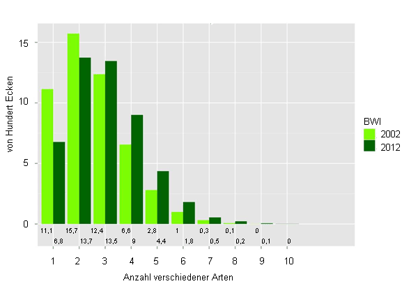 Bezüglich der Mischung zeigt sich ebenfalls ein Trend zu vielfältigeren Wäldern: Wälder, in denen nur eine Baumart vorkommt, sind gegenüber 2002 noch seltener geworden, denn an 93% der Inventurpunkte finden sich mittlerweile zwei oder mehr Baumarten. Traktecken mit Vorkommen von vier bis sechs Baumarten sind heute deutlich häufiger als noch im Jahr 2002 (Abb. 5).