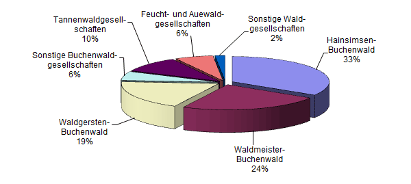 Naturräumlich ist Baden-Württemberg ein Land der Buchenwälder und Buchen-Tannen-Wälder, denn Buchenwaldgesellschaften werden auf 82% der Inventurpunkte als Potentielle Natürliche Vegetation (PNV) ausgewiesen. Die drei flächenstärksten Waldgesellschaften, Hainsimsen-, Waldmeister und Waldgersten-Buchenwald, bilden allein auf drei Vierteln der Waldfläche Baden-Württembergs den natürlichen Schlusswald. Die vier heimischen Tannen-Waldgesellschaften stellen auf 10% der Waldfläche die PNV dar, während die 17 übrigen in Baden-Württemberg vorkommenden Waldgesellschaften sich die restlichen 8% der Waldfläche als PNV teilen (Abb. 2).