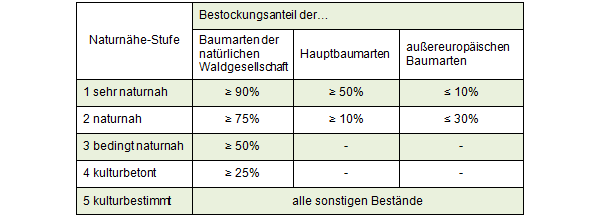 Die Einstufung der Naturnähe erfolgt an jeder einzelnen Wald-Traktecke des Inventurnetzes. Aus standortskundlichen Daten wird eine Waldgesellschaft als PNV bestimmt, für die regional und höhenzonal die natürlichen Haupt-, Neben- und Pionierbaumarten definiert sind. Die Bestimmung der insgesamt fünf Naturnähestufen erfolgt dann nach Schwellenwerten des Anteils der natürlichen Baumarten, die mindestens erreicht werden müssen. Für die beiden höchsten Naturnähestufen sind auch Höchstwerte für den Bestockungsanteil der ursprünglich außereuropäisch verbreiteten Baumarten formuliert (Tab. 1).