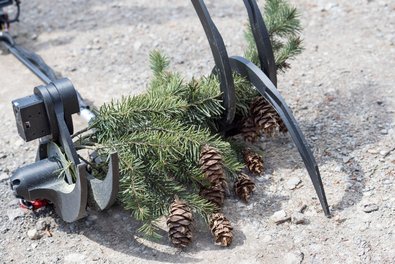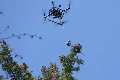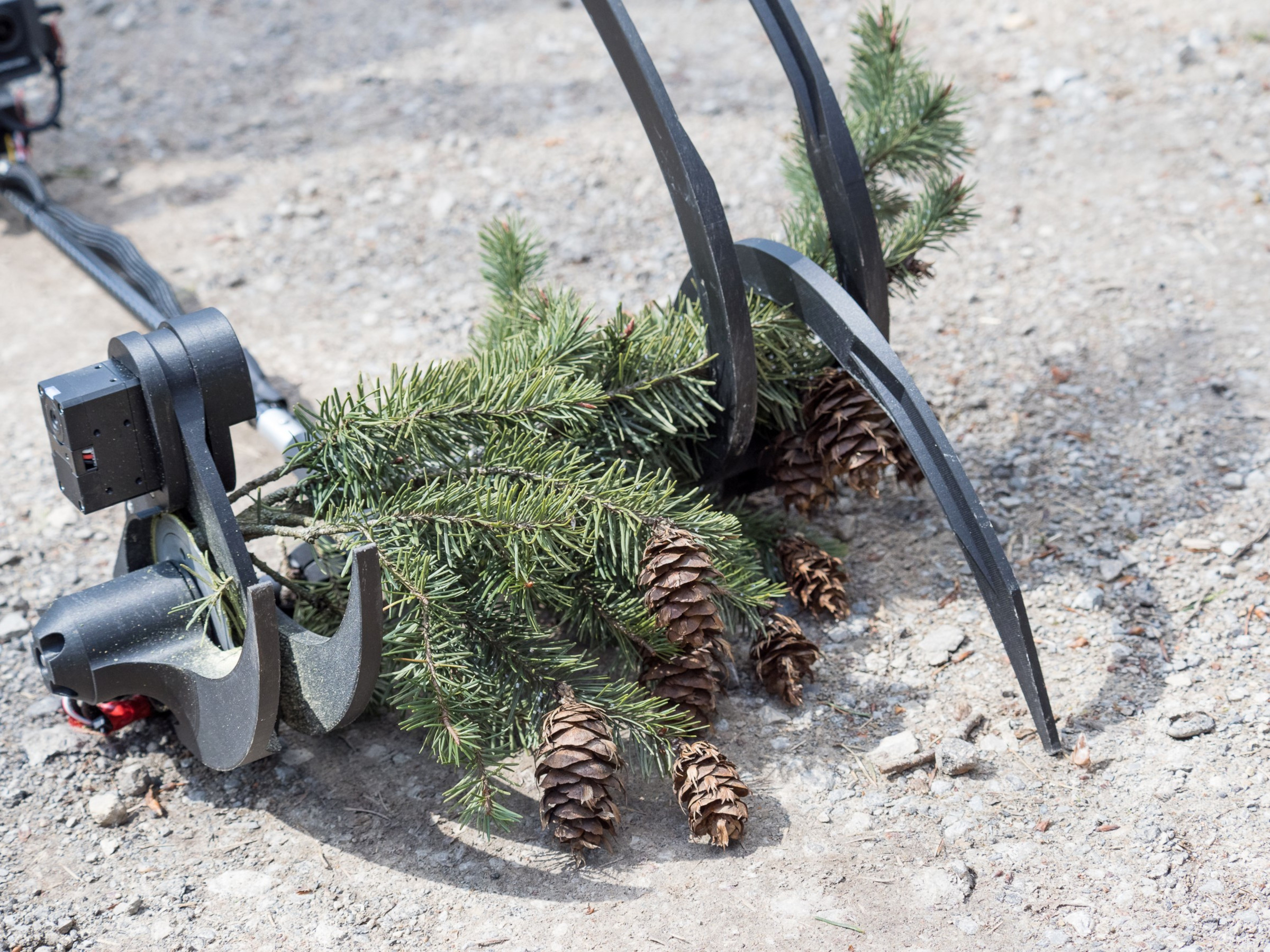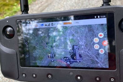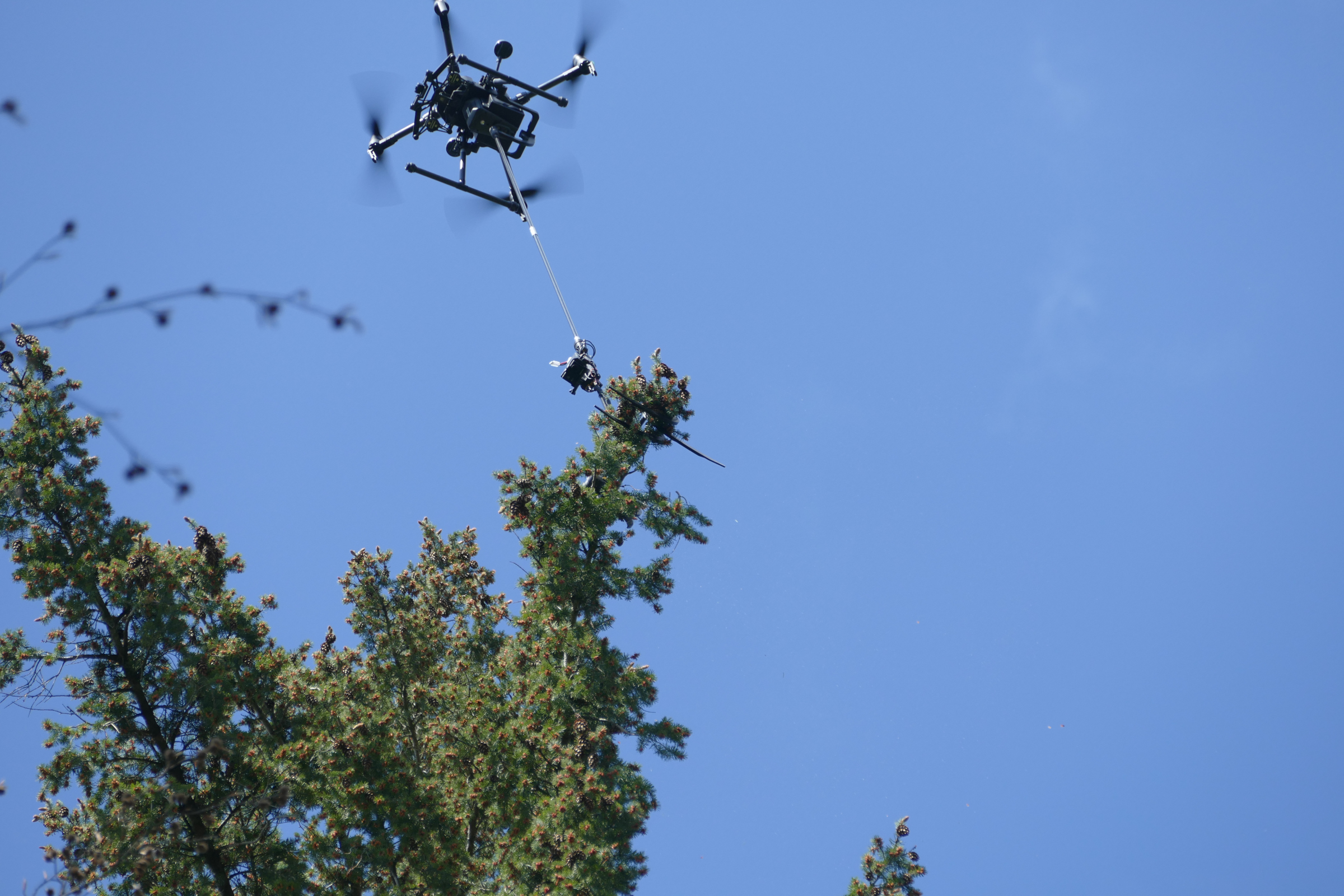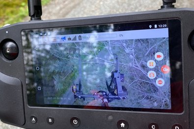 Für die direkte Probenentnahme verwenden wir einen drohnengetragenen Greifarm. Diese Technologie erlaubt die Entnahme von Astproben für DNA-Analysen und Samenproben zur Qualitätssicherung, die sonst nur aufwendig zu gewinnen sind. Der Greifarm wird an einer Trägerdrohne montiert. Er besteht aus einem Greifer und einer kleinen Kreissäge, die mit einem eigenen Akku betrieben wird. Die Steuerung erfolgt über eine separate Fernbedienung, die mit einem Display ausgestattet ist, das den Greifvorgang in Echtzeit visualisiert. Dies ermöglicht ein präzises Anfliegen, Greifen und Schneiden der Äste.