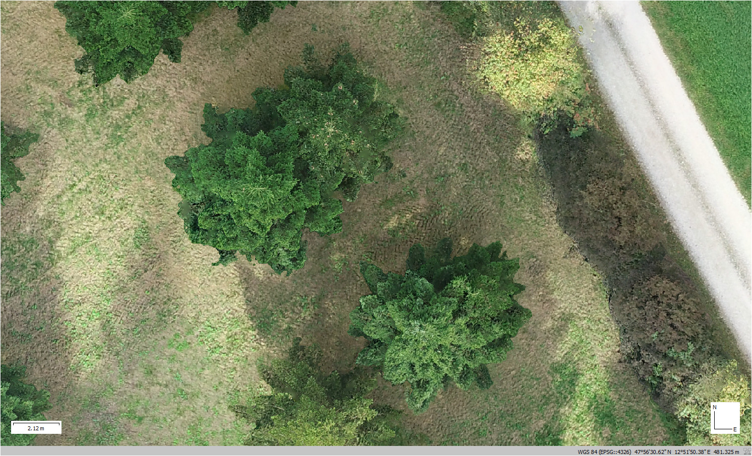 Drohnenbilder und sogenannte Orthophotos werden zur Ernteprognose und Bestandsaufnahme genutzt. Orthophotos bieten eine entzerrte, georeferenzierte und maßstabsgetreue Darstellung der Erdoberfläche, was präzise und konsistente Analysen ermöglicht. Die Datenaufnahme umfasst die Planung des Drohnenflugs und die Nachbearbeitung der Bilder mit spezieller Photogrammetrie-Software, um ein nahtloses und genaues Orthophoto zu erstellen. Diese Methode ermöglicht das Zählen und Schätzen von Saatgut und die Zuordnung zu einzelnen Bäumen, was wertvolle Informationen zur Bewirtschaftung liefert.