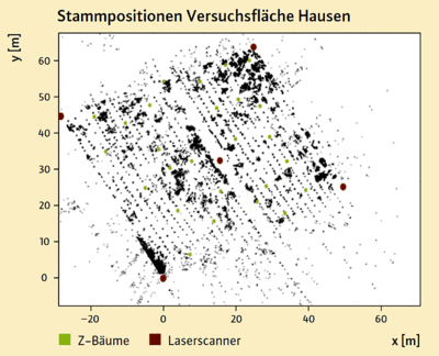 In einem virtuellen Schnitt durch die Scandaten in etwa zwei Metern über dem Boden (Abb. 2) werden die Verteilung der Z-Bäume sowie die Positionierung des Laserscanners ersichtlich.