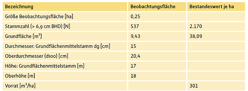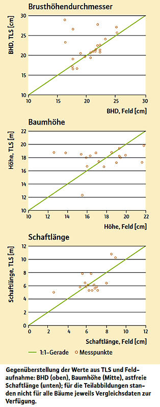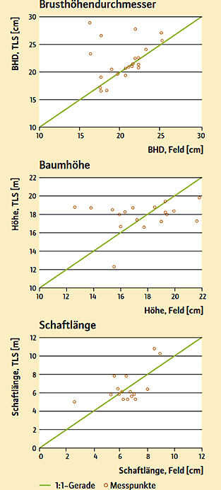 Der mittlere Brusthöhendurchmesser (BHD) aus den TLS-Daten lag rund 1,6 Zentimeter über dem Vergleichswert der Feldaufnahme. Die Höhenwerte liegen für die TLS-Daten im Mittel um 20 Zentimeter über den Daten der Höhenmessung im Feld. Die astfreien Schaftlängen liegen für die TLS-Daten und die Feldaufnahmedaten nur zehn Zentimeter auseinander.