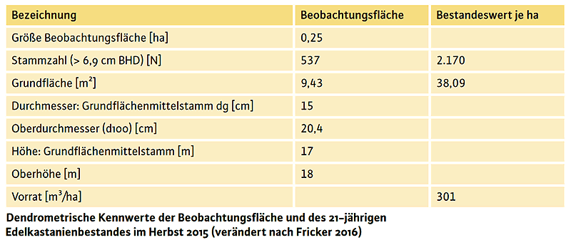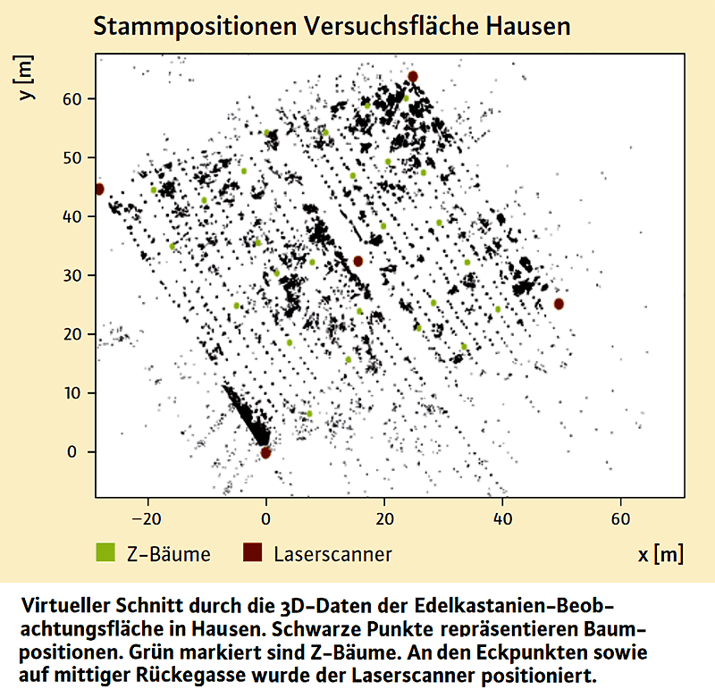 Aufgrund sich ändernder Klimabedingungen wird der Edelkastanie (Castanea sativa) künftig eine wachsende Bedeutung zugemessen. Bislang existieren in Bayern allerdings kaum Anbauerfahrungen. Daher hat die Bayerische Landesanstalt für Wald und Forstwirtschaft (LWF) im Jahr 2014 Edelkastanien-Bestände in der Gemeinde Hausen (Landkreis Würzburg) unter Dauerbeobachtung genommen. Auf den ältesten Teilflächen wurden ertragskundliche Vollaufnahmen durchgeführt. Zusätzlich wurden diese Flächen mit Hilfe terrestrischer Laserscantechnologie (TLS) aufgenommen. Abbildung 1 vermittelt einen Eindruck von der etwa 55 x 45 Meter großen Beobachtungsfläche und zeigt den Laserscanner.