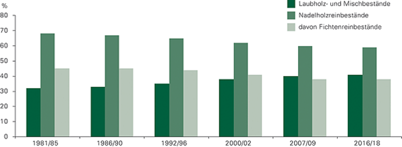 Im Vergleich der ÖWI-Perioden 1992/96 und 2000/02 nahmen die Laubholz- und Mischbestände in sieben Jahren bei gleichzeitigem Rückgang der Nadelholz- und Fichtenreinbestände noch um 3 % zu, bei den beiden letzten Inventuren 2000/02 und 2007/09 in sieben Jahren immerhin noch um 2 %. Im aktuellen Vergleich stieg der Anteil der Laubholz- und Mischbestände innerhalb von neun Jahren nur noch um rund 1 %, der Anteil der Fichtenreinbestände blieb annähernd gleich.