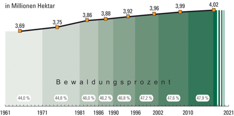 Ein stetiges Anwachsen der Waldfläche Österreichs kann bereits seit der ersten Erhebungsperiode der Österreichischen Waldinventur (ÖWI) 1961/70 von damals 3,69 Millionen auf nunmehr 4,02 Millionen Hektar beobachtet werden. Diese Zunahme des Waldes um rund 330.000 ha in einem halben Jahrhundert entspricht fast der Hälfte der Landesfläche von Salzburg (715.000 ha) oder mehr als einem Drittel von Kärnten (954.000 ha).