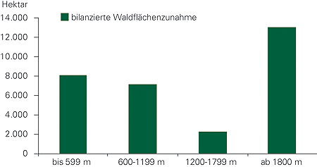 Ab 1800 m Seehöhe sind nur sehr geringe Abgänge an Waldfläche zu verzeichnen, weshalb mit rund 13.000 ha mehr als 40 % der gesamten bilanzierten Waldflächenzunahmen in dieser Hochlagenstufe vorkommen. Etwa 300.000 ha Wald stehen aktuell in einer Seehöhe ab 1800 m. Somit entfallen 4 % des Waldes dieser Höhenstufe auf Neubewaldung in den letzten neun Jahren.