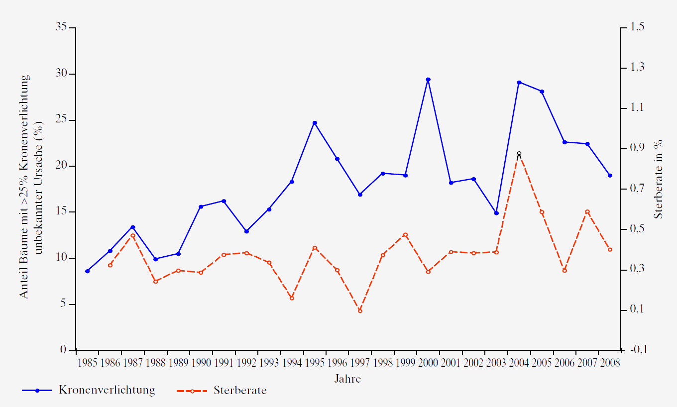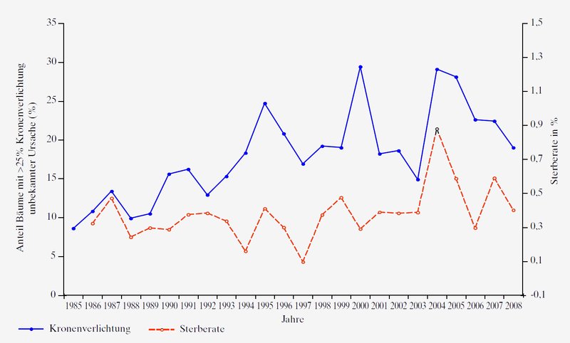 Der Anteil stark verlichteter Bäume stieg bis Mitte der 1990er Jahre stetig an (Abb. 2), zeigte aber danach bei grösseren jährlichen Schwankungen keinen langfristigen Trend. Ähnliches beobachtete man auch in Nachbarländern. Einige auffällige jährliche Zunahmen der Kronenverlichtung fallen mit speziellen klimatischen Ereignissen zusammen. So liess sich 1987 ein Grossteil der Zunahme durch Frostschäden im vorangegangenen Winter erklären. Die Anstiege 1990 und 2000 erfolgten nach den schweren Stürmen Vivian und Lothar. Der stärkste Anstieg der Kronenverlichtung erfolgte jedoch im Jahr nach dem Hitzesommer 2003.
