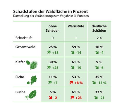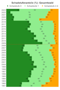 Der Wald konnte sich nach den extremen Trockenjahren in dem vergleichsweise feuchteren Jahr 2023 etwas erholen. Das Frühjahr war niederschlagsreich und im Verlauf der Vegetationsperiode waren die Waldbäume relativ gut mit Wasser versorgt. Im Vergleich zum extrem schlechten Zustand im Vorjahr verbesserte sich der Waldzustand leicht. Dennoch sind die mit dem Klimawandel zusammenhängenden Trocken- und Hitzeschäden der vergangenen Jahre weiterhin sichtbar.