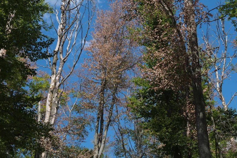 Eiche: Bei den Stiel- und Traubeneichen konnte ein durchschnittlicher Blattverlust von 24,9 % beobachtet werden, im Vorjahr waren dies noch 22,3 %. 37,2 % der Eichen wiesen eine deutliche Kronenverlichtung von mehr als 25 % auf, nur 11,4 % waren nicht geschädigt. Die mittelfränkischen Eichen schnitten in der aktuellen Waldzustandserhebung am besten ab, dort wurde nur ein mittlerer Blattverlust von 21,6 % festgestellt. Der Unterschied zwischen Nord- und Südbayern beträgt 6 Prozentpunkte, wobei die nordbayerischen Eichen mit 24,2 % die besseren Werte aufwiesen.