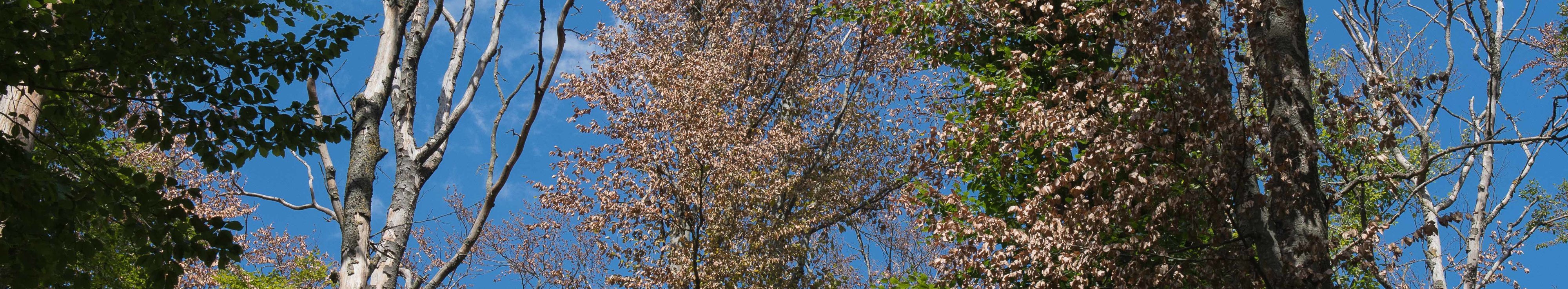 Buche: Buchen reagierten bereits im Jahr zuvor (kurz nach dem Aufnahmezeitraum der Waldzustandserhebung 2022) stark auf die Trockenheit und Hitze in den Sommermonaten. Der Einfluss dieser Witterungsextreme wurde mit einem durchschnittlichen Blattverlust von 23,5 % – um 3,7 Prozentpunkte schlechter als im Vorjahr – deutlich. 30,8 % der aufgenommenen Buchen wiesen deutliche Schäden auf, bei nur 15,5 % konnten keine Schadmerkmale festgestellt werden. Bei den Buchen wurden wegen des heißen und trockenen Sommers 2022 teils massive Trockenschäden beobachtet, welche vor allem in Unterfranken, Oberbayern und Mittelfranken auftraten. Bei den betroffenen unter- und mittelfränkischen Buchen waren die Kronen im Mittel zu 20% abgestorben. In Oberbayern zeichneten die von Trockenheit betroffenen Buchen nur halb so stark.
