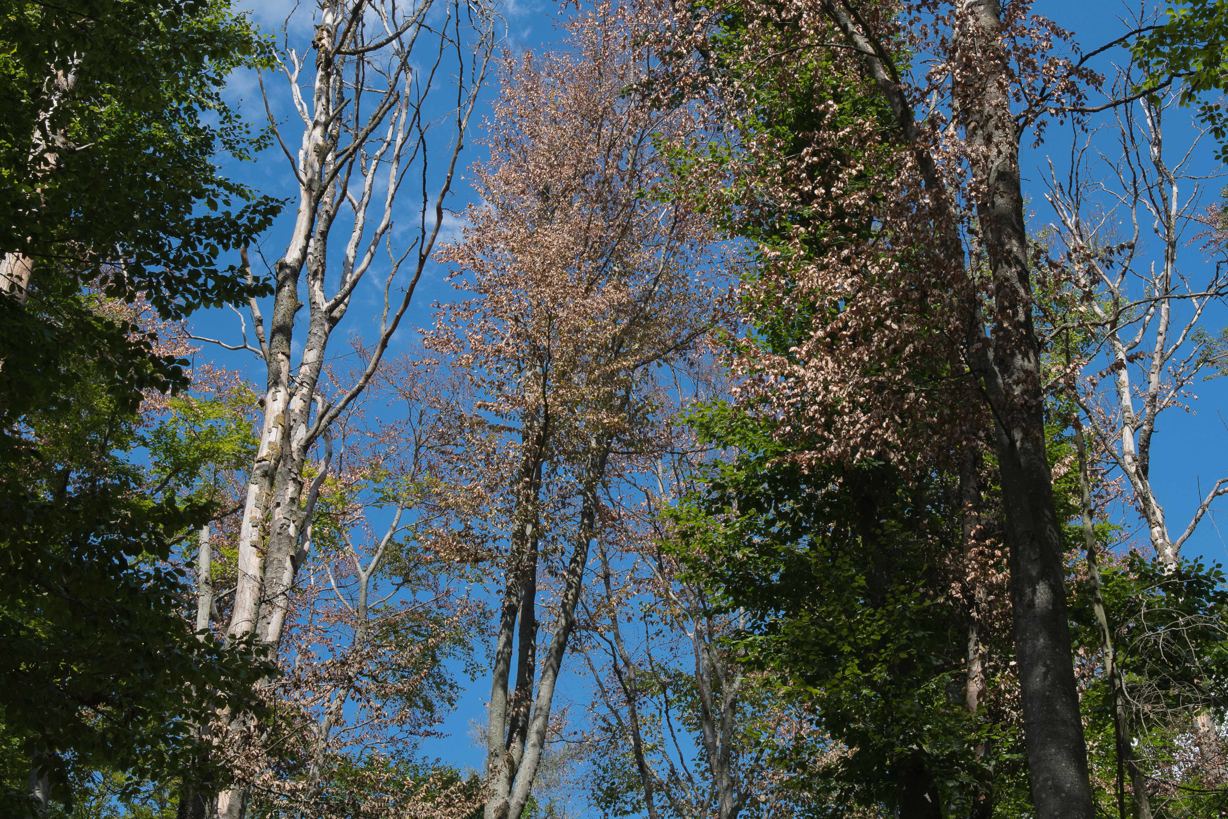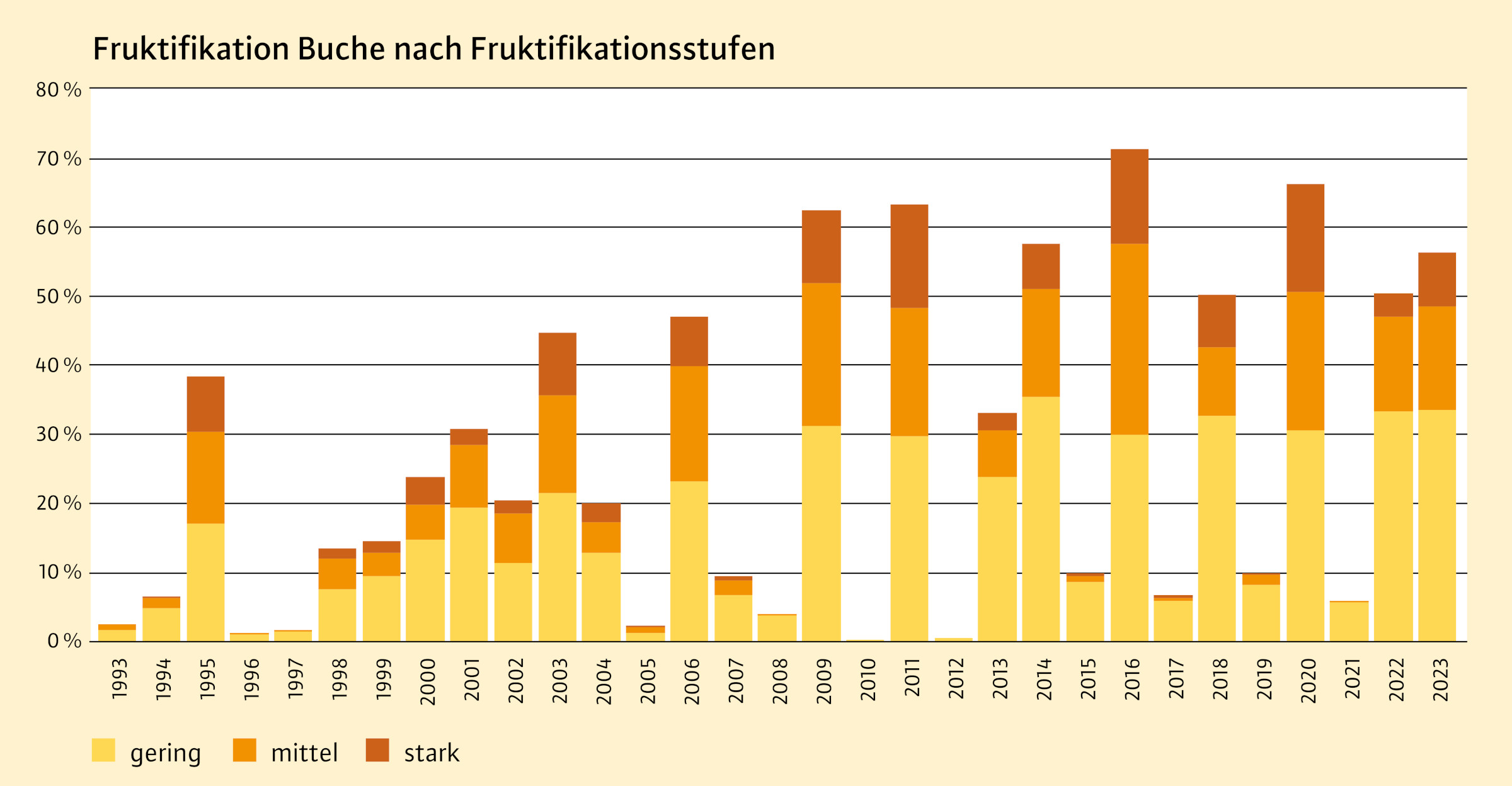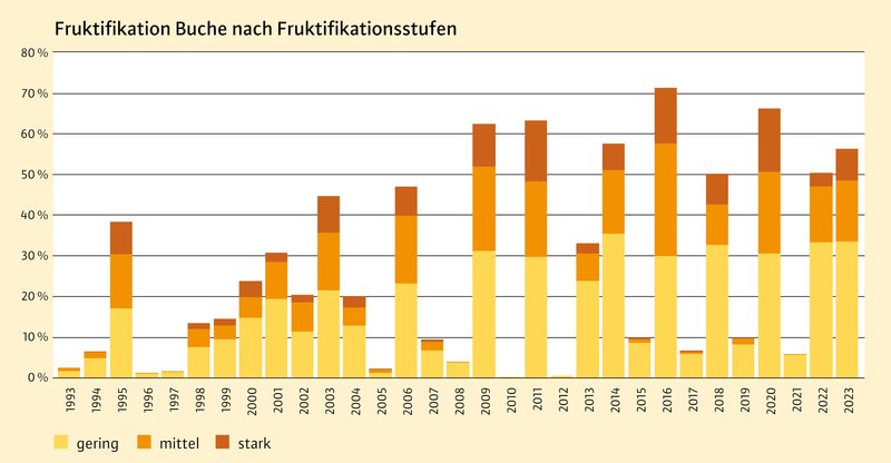 Warm-trockene Sommer begünstigen bei der Buche die Fruchtbildung im folgenden Jahr. Die Fruchtbildung bedeutet einen erhöhten Energieaufwand für die Bäume, was in wenigeren und auch kleineren Blättern resultieren kann und damit direkten Einfluss auf die festgestellte Kronenverlichtung hat. Seit Jahren kann ein erhöhtes Fruchtaufkommen bei den Buchen beobachtet werden. In der aktuellen Waldzustandserhebung konnte bei 56,3 % der Buchen ein Fruchtbehang festgestellt werden. 22,8 % der Buchen fruktifizierten im mittlerem bis starkem Ausmaß.