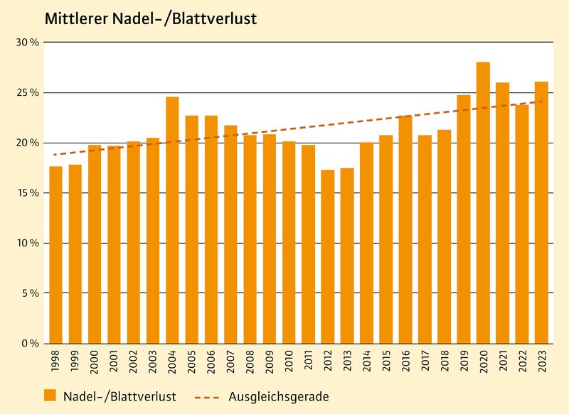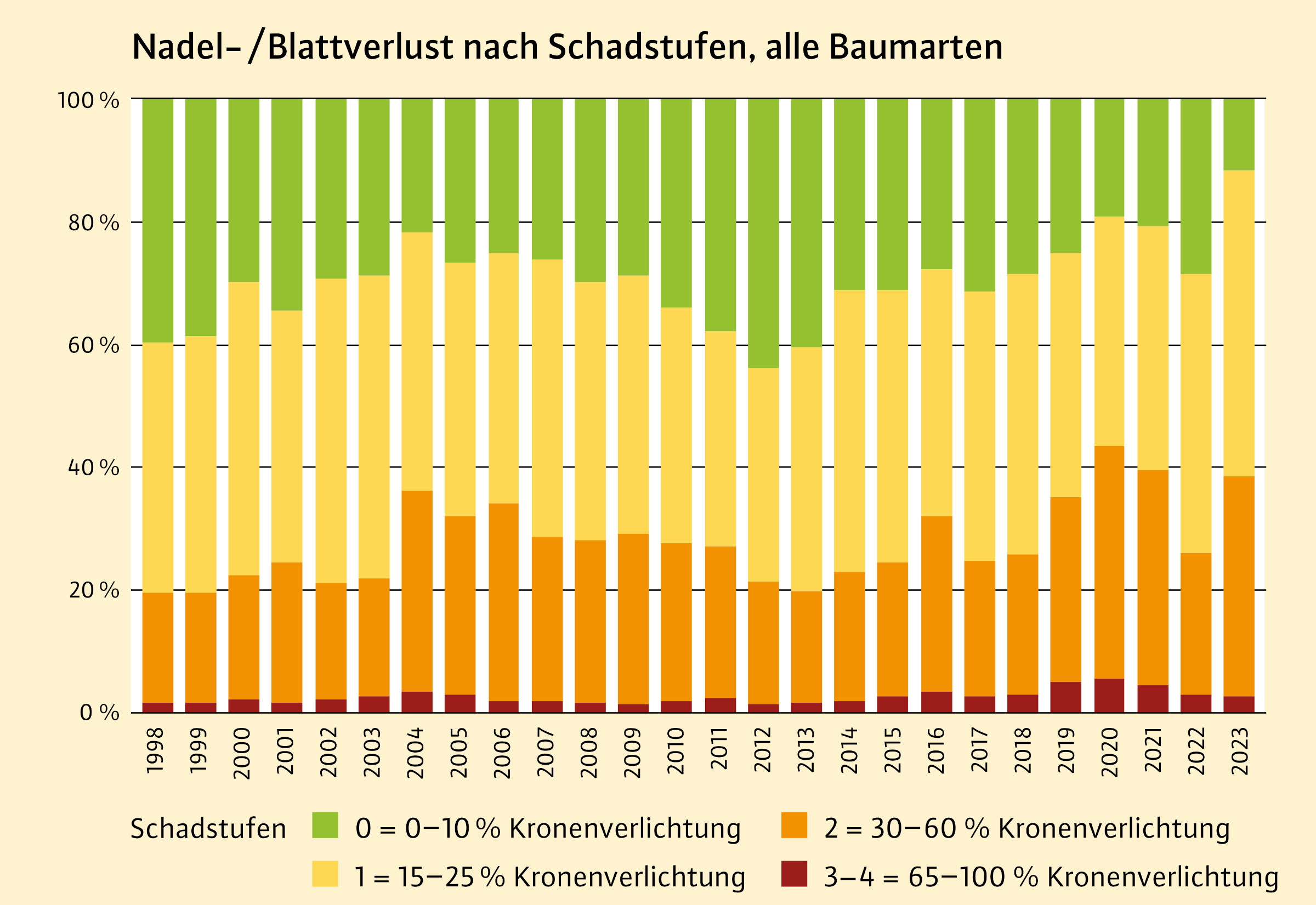 Betrachtet man alle Baumarten zusammen, erhöhte sich der Anteil der Bäume, welche in der Schadstufe 2 enthalten sind, auf 36,0 % (2022: 23,1 %). Diese Bäume weisen einen Nadel- beziehungsweise Blattverlust von 30–60 % auf. Gleichzeitig verringerte sich der Anteil der Bäume ohne deutliche Schäden von noch 28,5 % im Jahr 2022 auf 11,6 %. Abbildung 5 gibt einen Überblick über die Entwicklung der Anteile der Schadstufen aller Baumarten in den letzten 25 Jahren. Auch hier sind die auf Trockenjahre folgenden stärkeren Schäden zu erkennen. Über alle Baumarten hinweg konnte dieses Jahr ein durchschnittlicher Nadel- beziehungsweise Blattverlust von 26,0 % (2022: 23,8 %) festgestellt werden.