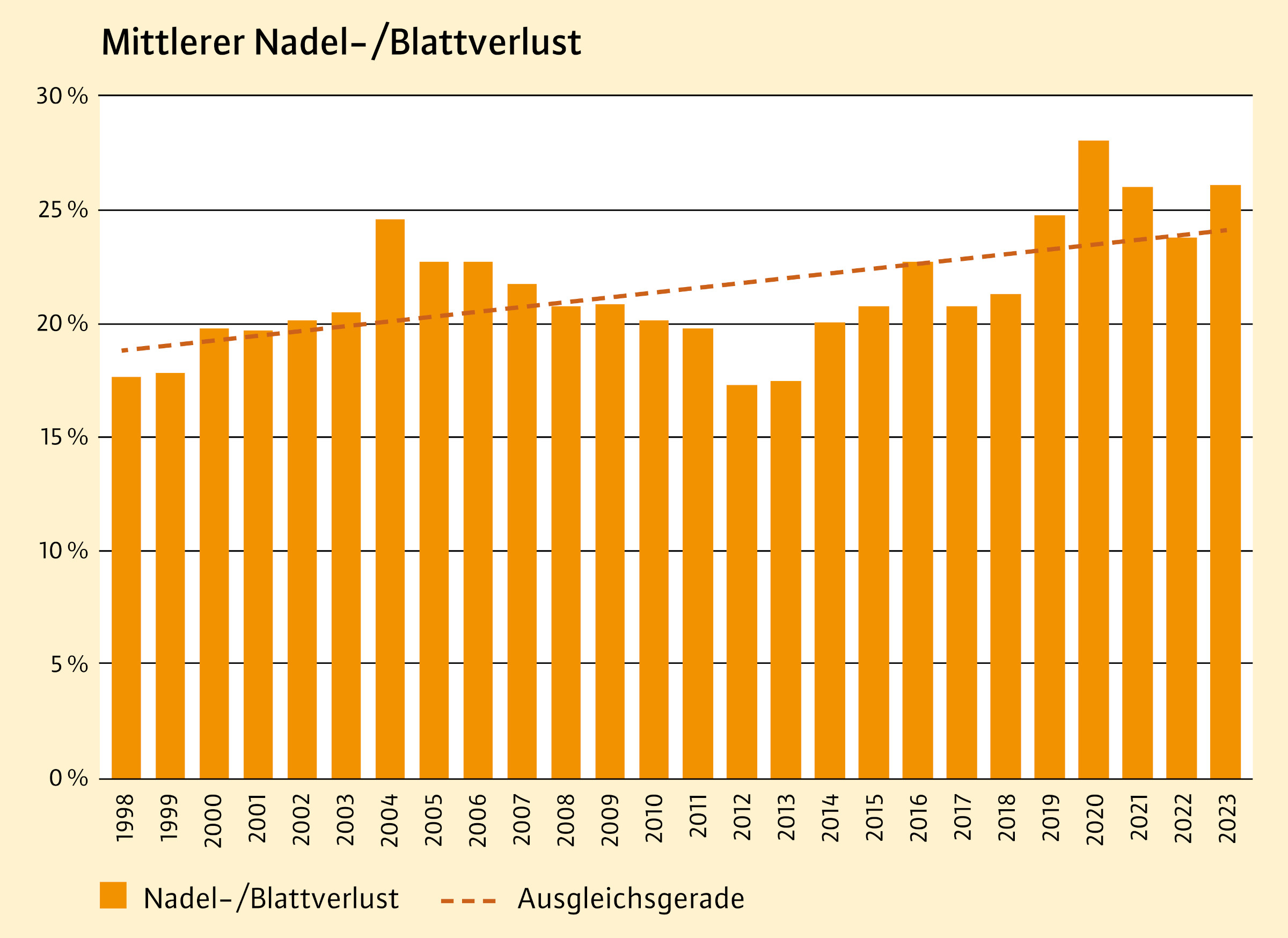 Abbildung 2 gibt einen ersten Überblick, wie sich der durchschnittliche Nadel- beziehungsweise Blattverlust in den letzten 25 Jahren entwickelt hat. Die mittlere Kronenverlichtung der bayerischen Bäume stieg in den letzten Jahren tendenziell an und erreichte 2023 einen Wert von 26,0 % und liegt damit auf demselben Niveau wie 2021. Die Grafik zeigt anschaulich, dass jeweils in den auf Dürre und Hitzeperioden folgenden Jahren der durchschnittliche Nadel- beziehungsweise Blattverlust ansteigt, wie etwa in den Folgejahren nach 2003, 2015 sowie 2019. Entsprechend erfolgte auch auf den trockenen und heißen Sommer 2022 eine Erhöhung um 2,2 Prozentpunkte.