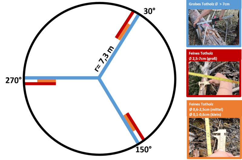Abb. 2. Schematischer Aufbau der Transekte. Farben kennzeichnen die vorgegebenen Abschnitte, in denen die unterschiedlichen Sortimente erfasst werden, sobald die Holzstücke das Transekt berühren. Grobes Totholz – In der blauen Sektion (Länge 7,3 m) werden alle Derbholz-Elemente mit einem Durchmesser über 7 cm und einer Mindestlänge von 1 m erfasst. Am Schnittpunkt des Stammes mit dem Maßband wird zunächst der Transekt-Durchmesser mittels Vollkluppung ermittelt. Ebenfalls wird notiert, ob die Messung mit oder ohne Rinde erfolgte und die Verfalls-Klasse bestimmt. Feines Totholz – In der roten Sektion (Länge 3,0 m) werden die Feinreisig-Stücke in der Kategorie “groß” (Ø 2,5 – 7 cm) gezählt. Bei großen Stückzahlen über 20 wird ein Schätzwert angegeben. In der orangenen Sektion (Länge 1,8 m) werden Holzstückchen der Kategorien “mittel” (Ø 0,6 – 2,5 cm) und “klein” (Ø 0 – 0,6 cm) gezählt. Der Schwellenwert für die Schätzung liegt hier bei 50 Stück.
