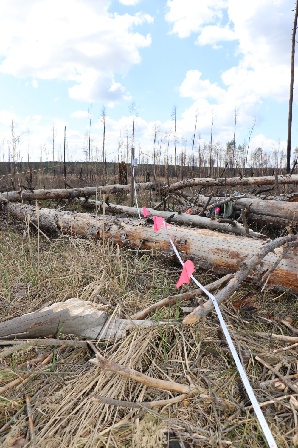 Ein Ziel der PYROPHOB-Arbeitsgruppe am Landeskompetenzzentrum Forst in Eberswalde (LFE) ist es, die Gesamtmenge des orderirdischen Totholzes in all seinen Ausprägungen zu erfassen, von Stammholz-Dimensionen bis hin zum Feinreisig. Auf den Untersuchungsflächen konnte bereits dokumentiert werden, dass der Zusammenbruch des belassenen, abgängigen Bestandes etwa drei Jahre nach dem Brandereignis eintritt: Das stehende wird zu liegendem Totholz. Die Flächen sind dadurch teilweise extrem schwer zugänglich. Die Grundstabilität dieser Bestände ist insgesamt beeinträchtigt und das Gefahrenpotenzial hoch. Zur Planung der Geländearbeiten wurde in der Arbeitsgruppe daher stets die aktuelle Witterungslage berücksichtigt. So wurden windarme (mit einer maximalen Windgeschwindigkeit von 12 Knoten) und trockene Tage gewählt, da sich die Fortbewegung auf nassem Totholz als riskant erwies.
