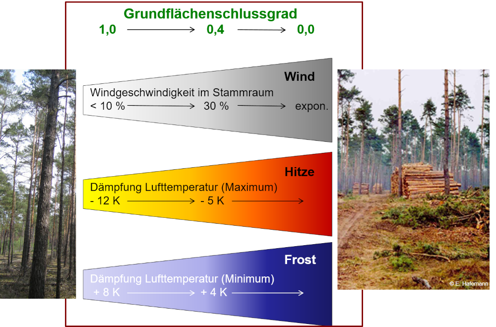 Erfolgt die Prognose von Kahlfraßereignissen muss bei Entscheidungen über Waldschutzmaßnahmen immer einkalkuliert werden, dass ein Verlust des Kiefernschirms Konsequenzen für die folgende Verjüngung auf den Störungsflächen hat. Das trifft sowohl bei einem Totalverlust des Bestandes als auch bei einer Verlichtung durch Fraßschäden zu. Die Abnahme des Kronenschlussgrades und damit die schützende Wirkung der Altkiefern hinsichtlich Frost, Hitze und Wind nimmt sehr deutlich ab (Kallweit & Mayer 2008). Bei vielen Umbaumaßnahmen wird mit einem lichten Kiefernschirm dieser Schutzmechanismus anteilig genutzt.
