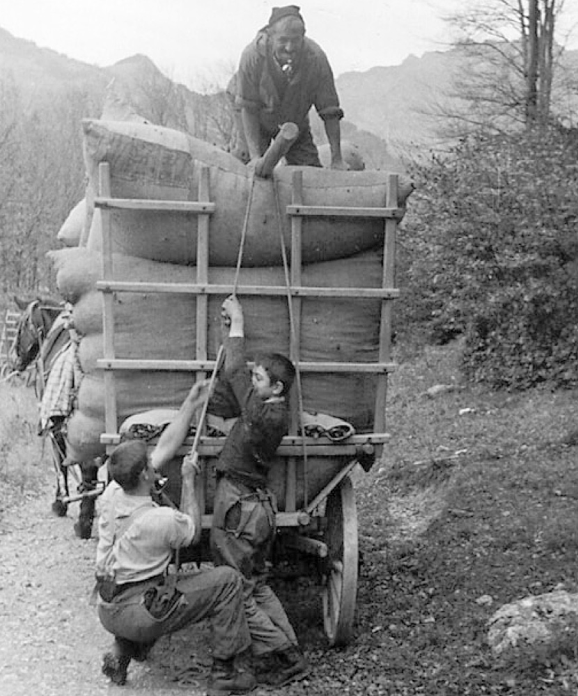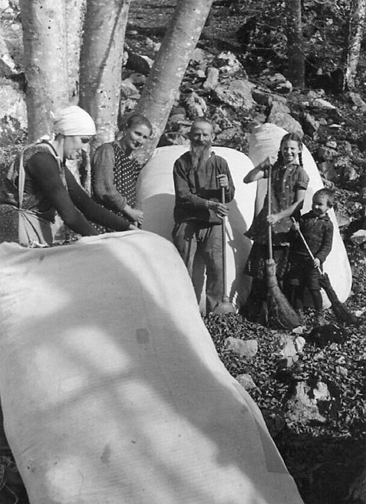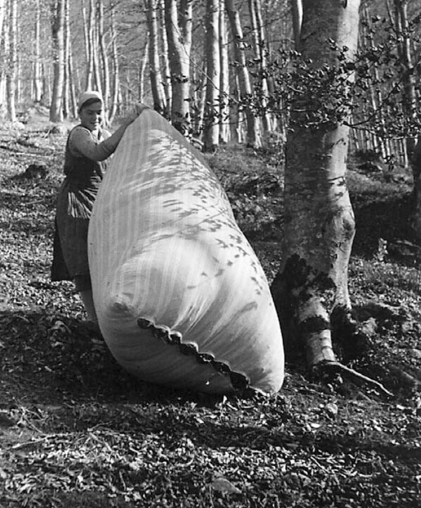 Im Wald wurden grosse Haufen zusammengewischt, und man füllte das Laub in die Säcke (Abb. 2, 3). Es handelte sich entweder um die Bettsäcke, die vom Wald direkt auf die Bettstatt kamen, oder es wurden Säcke unterschiedlicher Grösse oder Tücher verwendet, die nur als Verpackung bis nach Hause dienten.