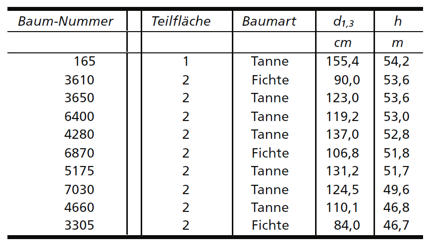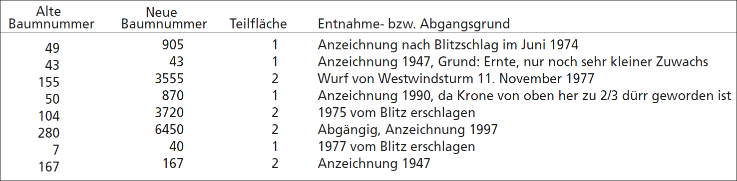 Eine genaue Vermessung der Tanne 165 und der Fichte 3610 ergab Baumhöhen von 55,1 bzw. 55,4 m (die Unterschiede liegen in der Messtechnik oder in einem leichten Schiefstand der Bäume). Allerdings hat die Tanne 165 beim Sturm Lothar im Dezember 1999 ein Gipfelstück von rund zehn Metern verloren. Die Gründe, weshalb acht der zehn dicksten Bäume von 1932 verschwunden sind, sind in Tabelle 3 zusammengestellt. Auffallend ist mit fast 40% der hohe Anteil an Blitzschlägen. Nur zwei der acht Tannen können als ordentliche Anzeichnung bezeichnet werden.