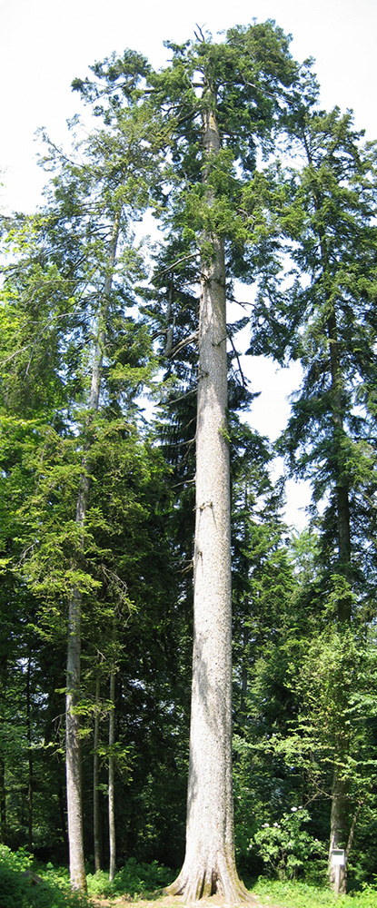 Abb. 2 - Die stärksten Tannen um 1914. Zwischen den Stämmen steht ein Mann. Foto: Hermann Knuchel
