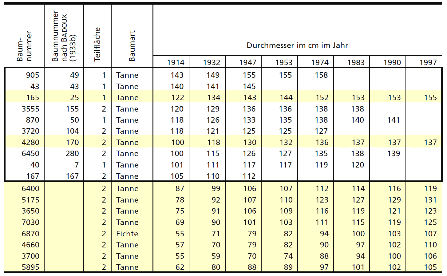Gemäss Bundesratsbeschluss vom 19. März 1912 "sind 10 der stärksten und schönsten Bäume zu bezeichnen, welche möglichst lange überzuhalten sind. Bei späteren Nutzungen einzelner Stämme sind dieselben durch wüchsige Stämme immer wieder auf die Zahl von 10 zu ersetzen." BADOUX (1933b) listete die bei der Aufnahme von 1932 ermittelten zehn stärksten Stämme auf. Sie hatten damals einen Umfang in Brusthöhe von 469 cm bis 348 cm, was Durchmessern von 149 cm bis 111 cm entspricht. Diese Bäume wiesen in den acht Jahren von 1924 bis 1932 einen Umfangzuwachs von 0 bis 23 cm auf, was einer maximalen Jahrringbreite von 4,6 mm entspricht. Von diesen zehn Bäumen stehen heute noch zwei: die Tanne 165 (bei Badoux 25) in Teilfläche 1, die 1932 an dritter Stelle stand, und eine Tanne aus Teilfläche 2. Die Tabelle 1 beschreibt die zehn stärksten Bäume im Jahr 1997.