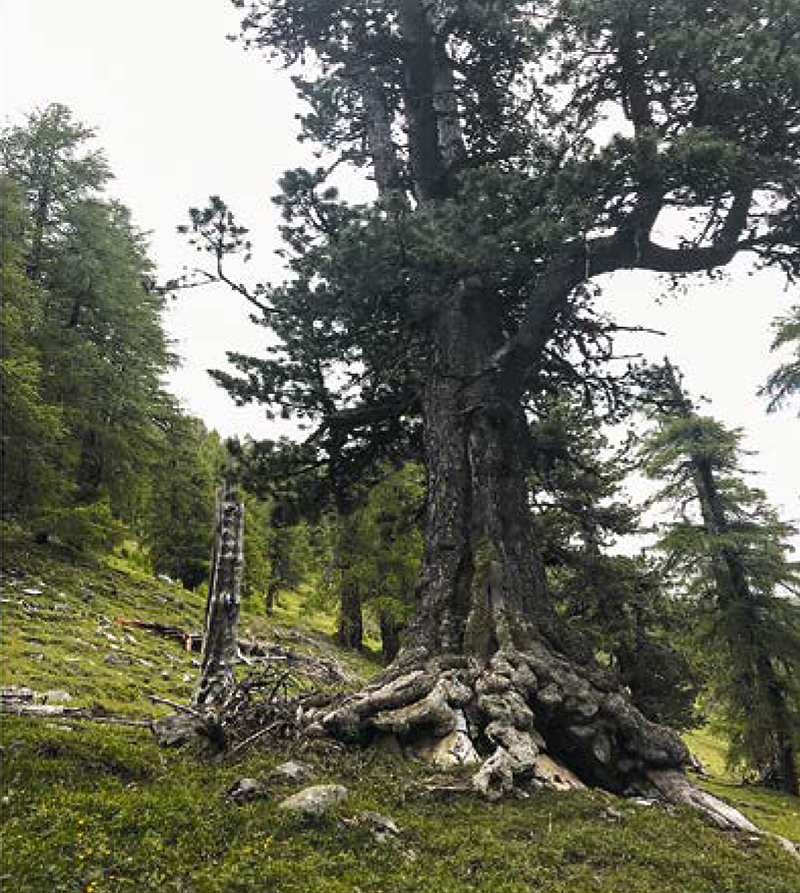 Abb. 6. Links: Alte Arven im oberen Capettawald, die bis vor wenigen Jahren als dominante Einzelbäume wuchsen, werden zunehmend vom Jungwald bedrängt. Rechts: Uralte, entwurzelte Arve im unteren Capettawald. Im heute dunkeln Bestand kann sich die Lärche nur noch in Öffnungen und auf Wurzelstöcken verjüngen. Fotos: Andreas Rigling (ETHZ)